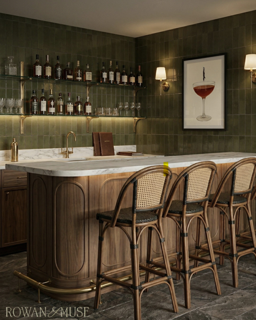 The glossy olive tile creates the moody foundation of the room and adds depth behind the bar.