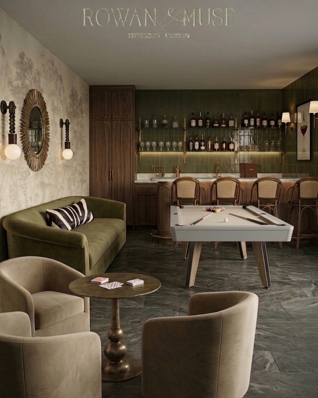 This space blends European lounge elegance with relaxed game room functionality. Instead of the typical basement-style game room, the design leans into warm materials, layered textures, and moody green tones to create a room that feels like a private club.